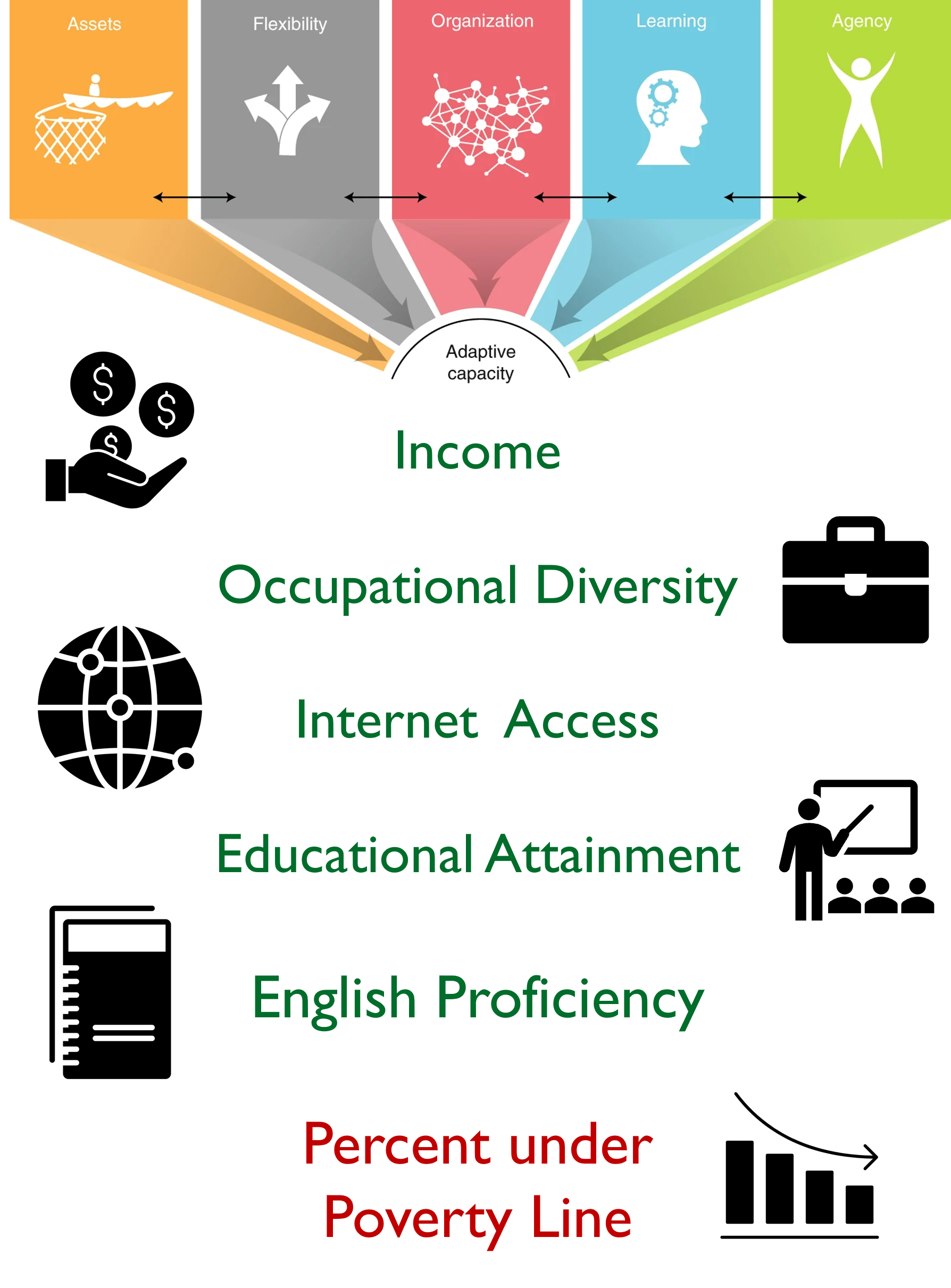 To build the adaptive capacity index, we used the framework introduced by Cinner et al. (2018), where adaptive capacity reflects the ability of communities to cope with stress and adapt to change. Indicators were taken from the American Community Survey and averaged across the most recent five years. Each of the five sectors in the framework was represented by a corresponding metric. For the assets index, income was used. For the flexibility index, occupational diversity was used. For the organization index, internet access was used. For the learning index, educational attainment was used. Agency was represented by English proficiency and the percentage of the population living under the poverty line. In this framework, higher values of the first five indicators are positively associated with adaptive capacity, while the percentage under the poverty line is negatively associated.