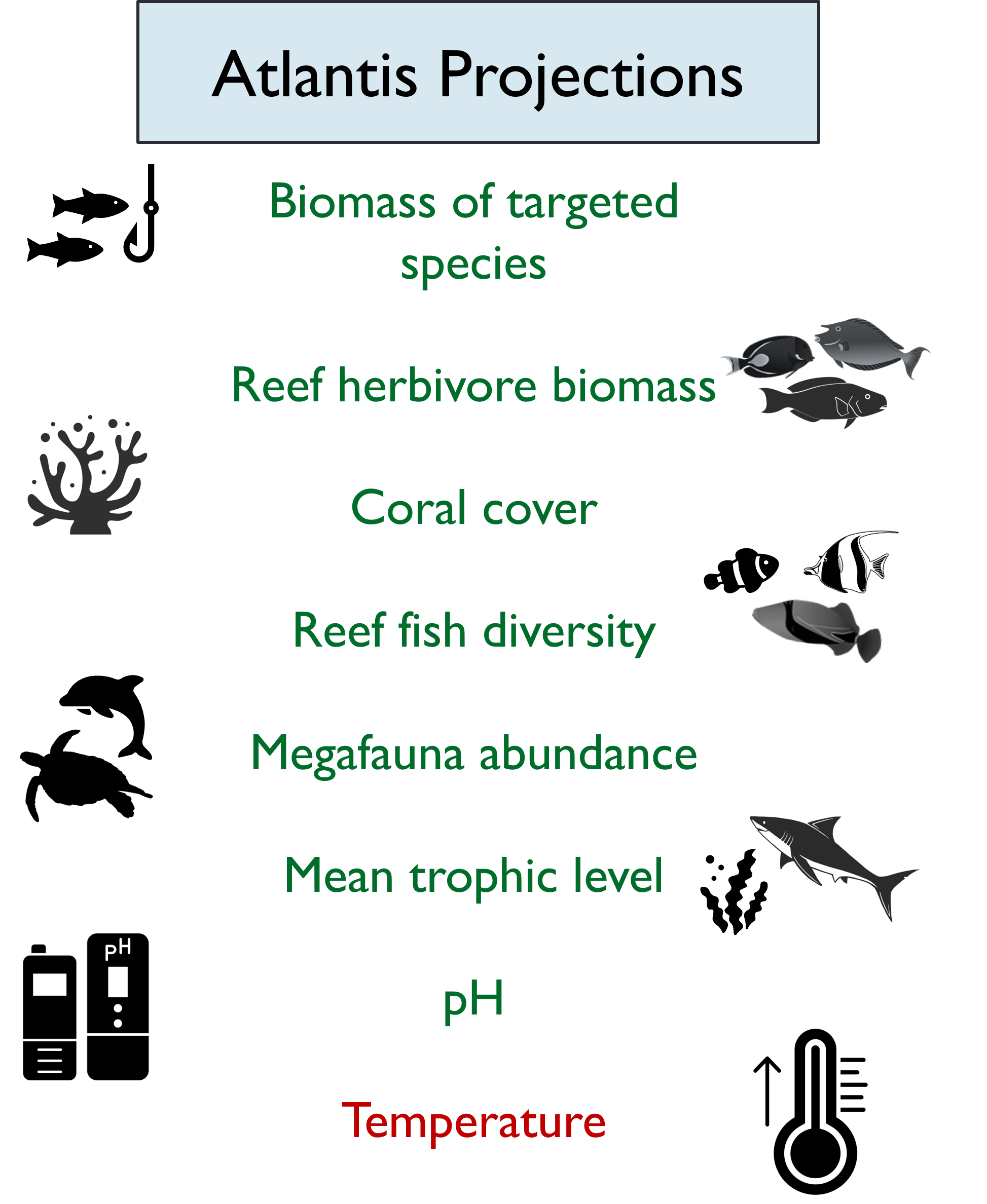 To build the exposure index, we used projections from the Atlantis ecosystem model. Exposure reflects the degree to which reef systems are stressed by climate and ecological change, with higher stress corresponding to higher exposure. Most ecological indicators, such as biomass, diversity, and coral cover, reduce exposure when values are high, while temperature contributes positively, with higher temperatures increasing exposure. Together, these indicators capture how ecological and environmental conditions shape overall exposure across reef systems.