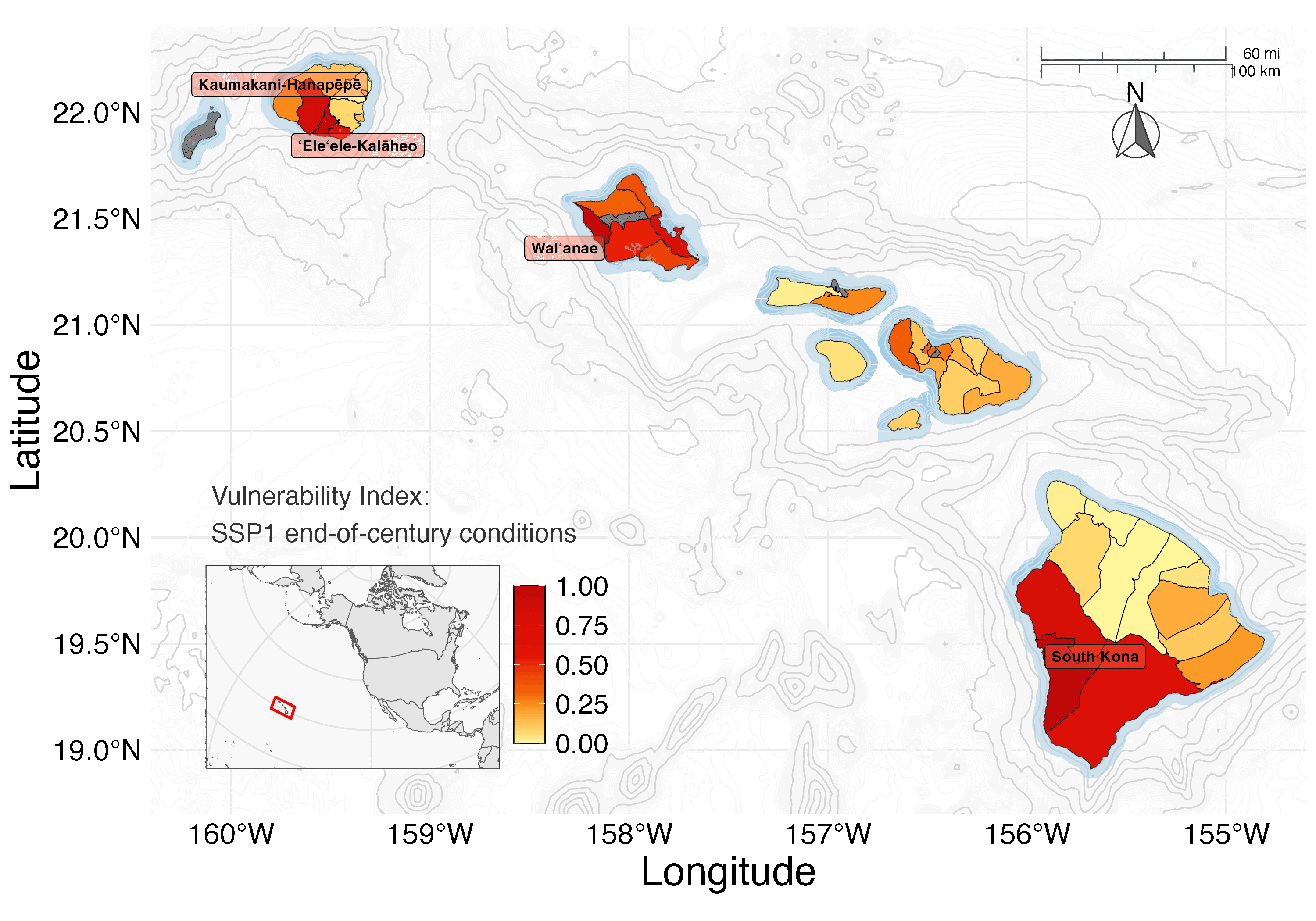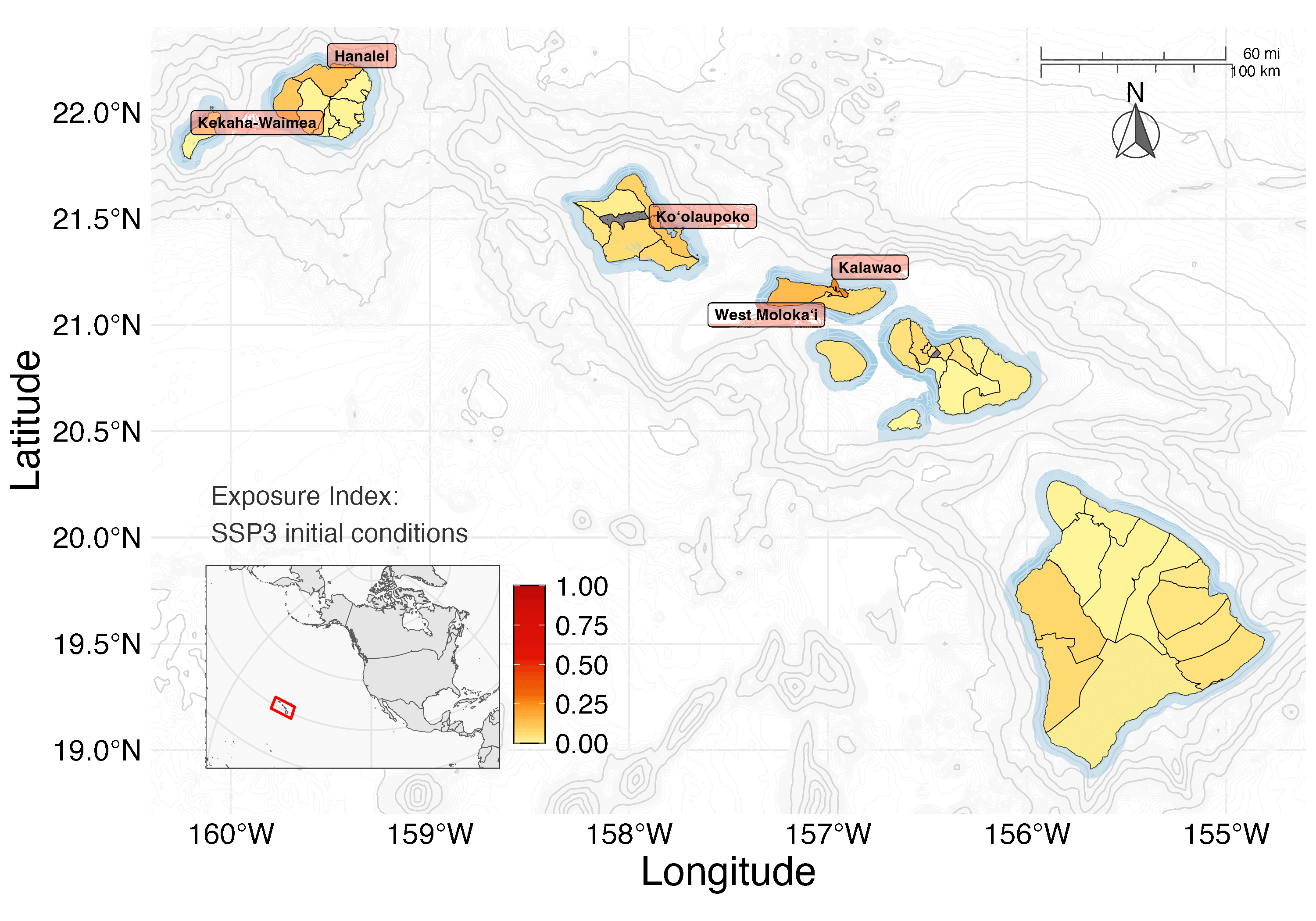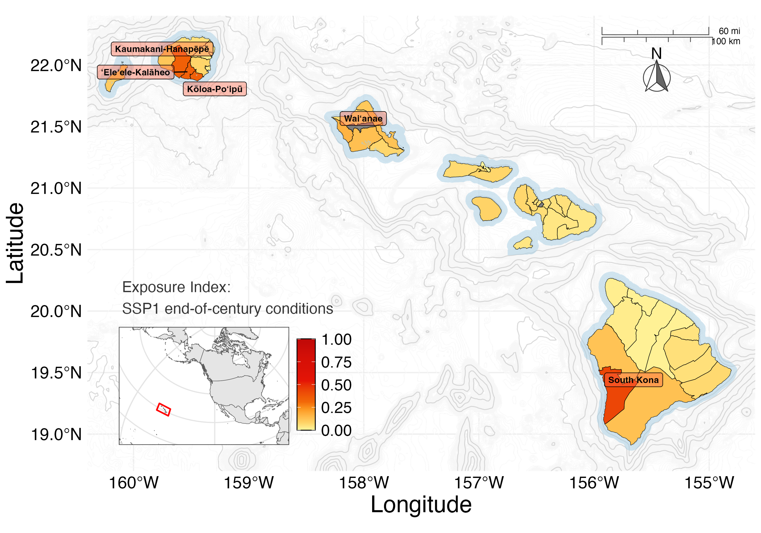 Under SSP1, exposure remained relatively low across the main Hawaiian Islands, with South Kona standing out as the only community to remain in the top 10% of scores across all climate scenarios.