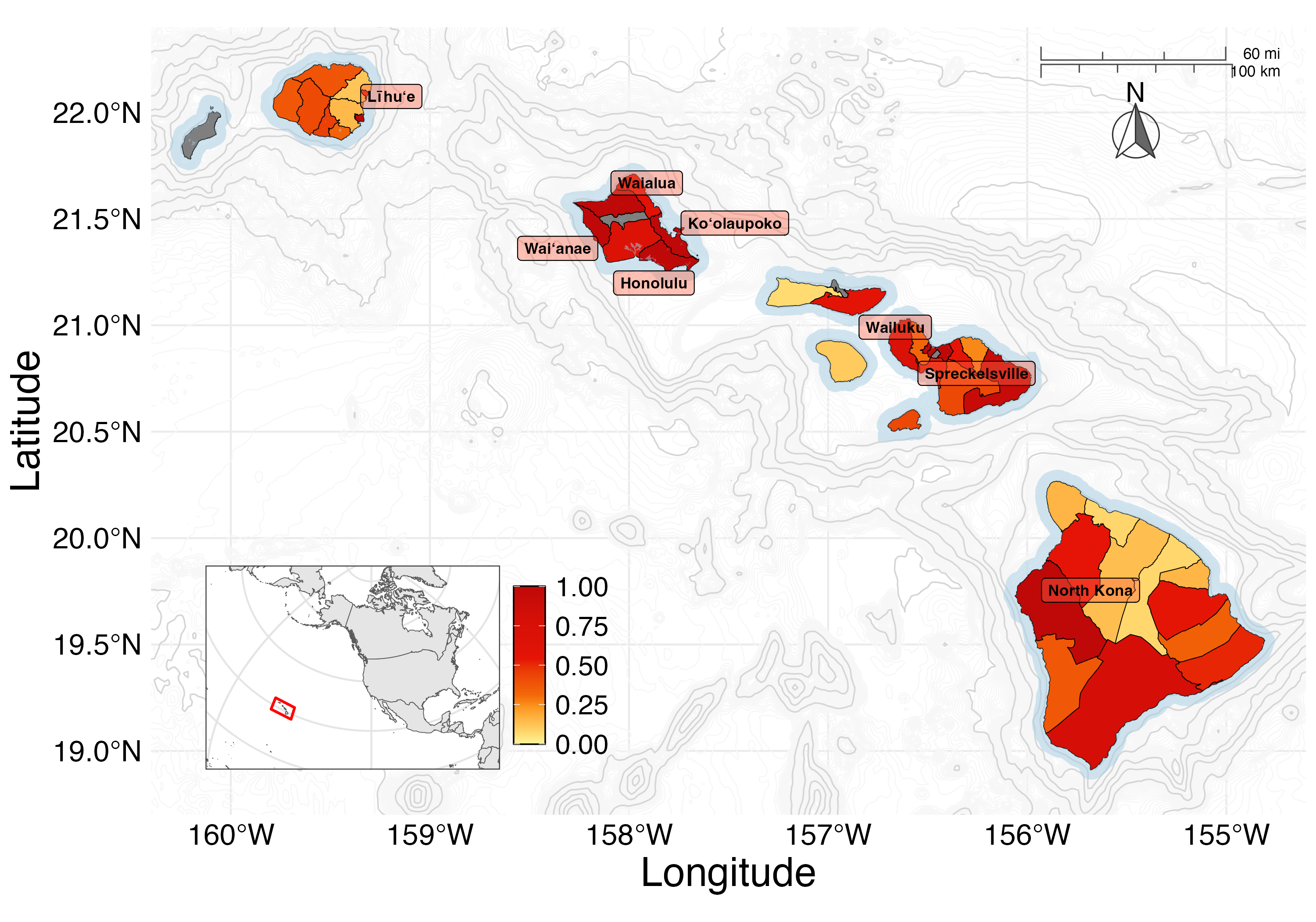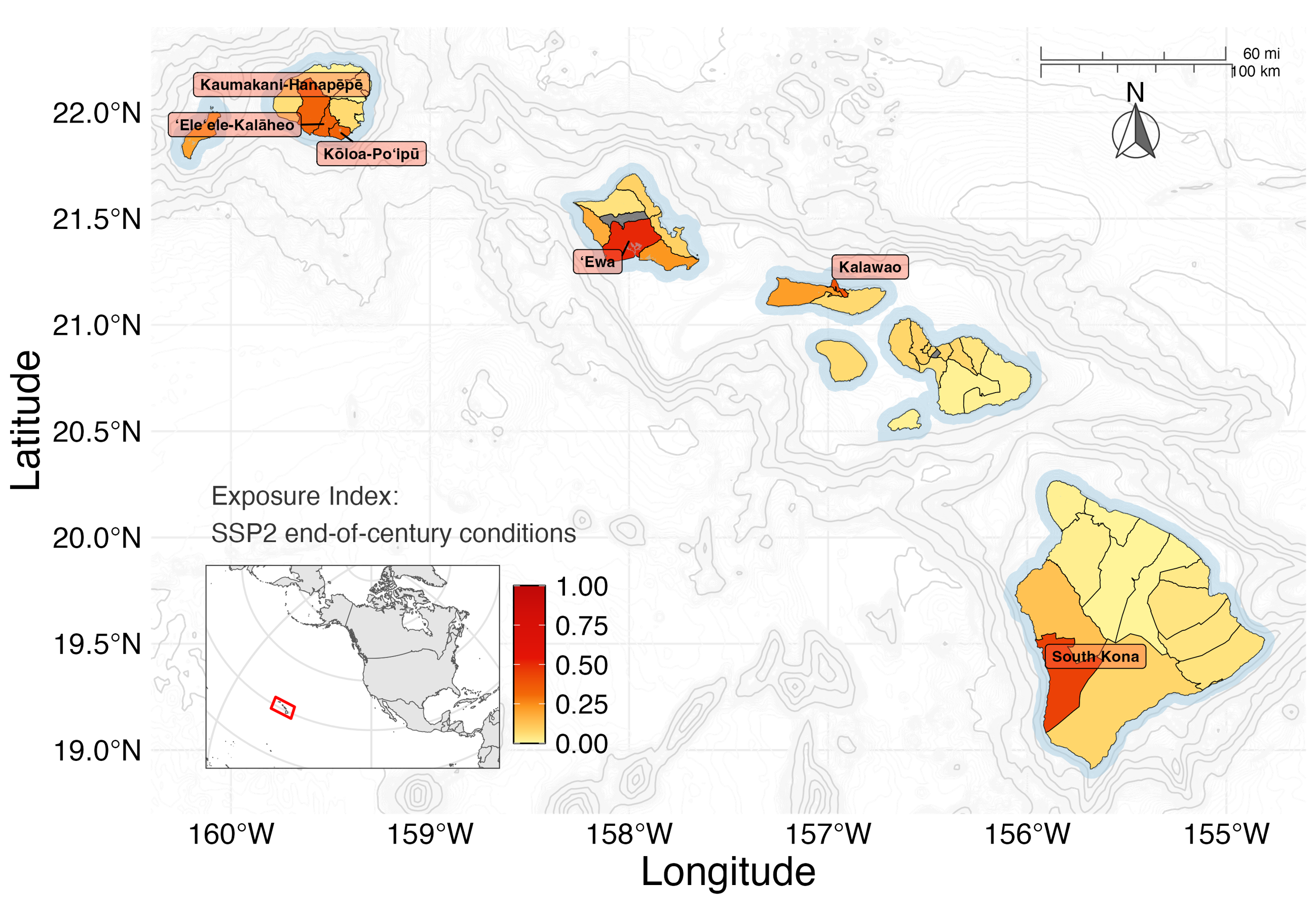 Comparing end-of-century exposure across climate scenarios shows notable differences. Under SSP2, Honolulu and Kaʻū are no longer among the most highly exposed communities, while ʻEwa on Oʻahu and South Kona on Hawaiʻi Island remain in the top 10% of exposure index scores.