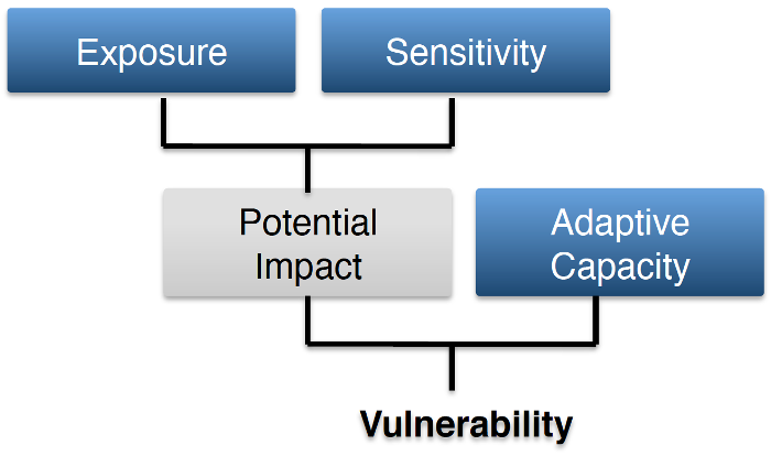 We quantified vulnerability using a framework introduced by Marshall et al. (2009), where vulnerability is shaped by exposure, sensitivity, and adaptive capacity. Exposure refers to the extent to which a region, resource, or community experiences stressors. Sensitivity captures the susceptibility to harm from those stressors, including dependence on resource systems affected by climate change. Adaptive capacity represents the ability to cope with stress and recover. Together, these components determine the potential impact and overall vulnerability of ecological and social systems.